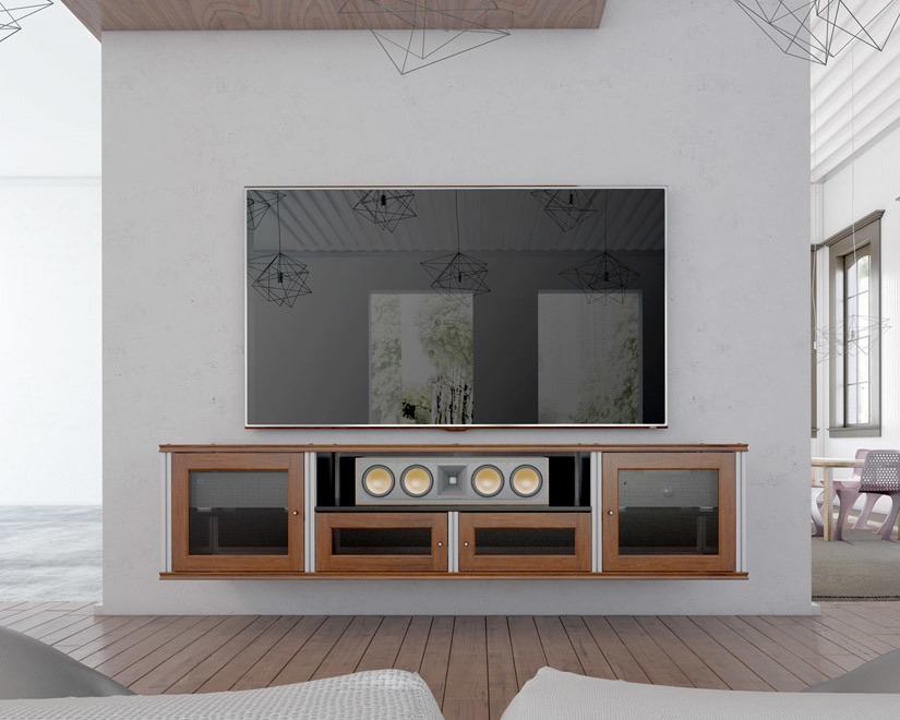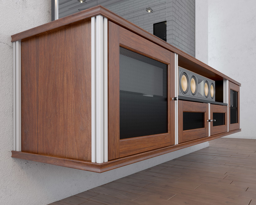 Look to our Synergy wall hanging system to create a very unique furniture presentation, It makes the cabinets appear to float above the ground. The effect is quite dramatic. Best of all the system is designed to work with all Synergy cabinet widths: single, twin, triple and quad.