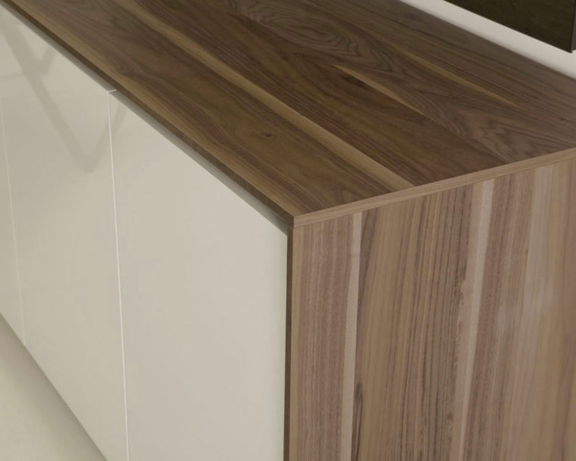 Available in Natural Walnut finish with Smoked Glass Doors or Gloss White doors
