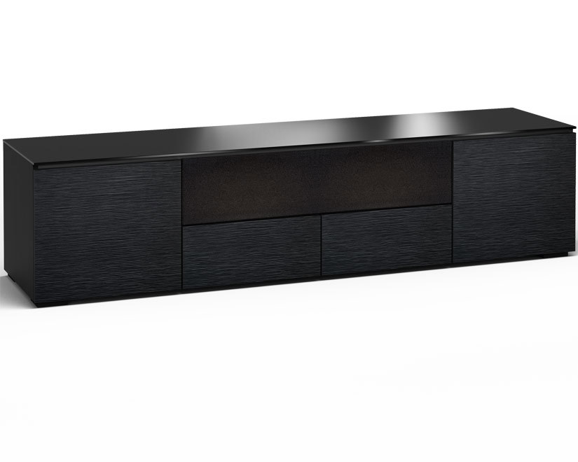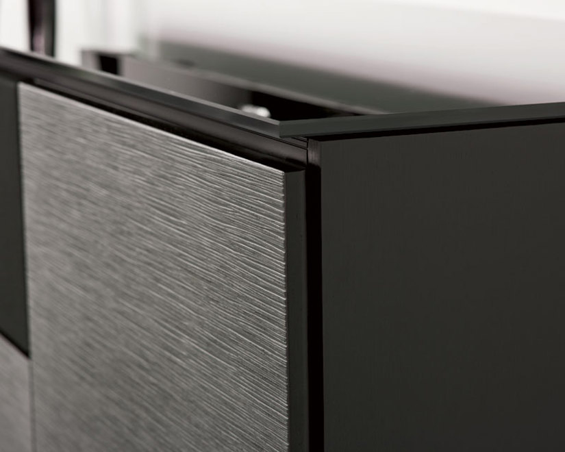 Lightly textured, black oak doors with black, tempered glass top and black oak finished side panels