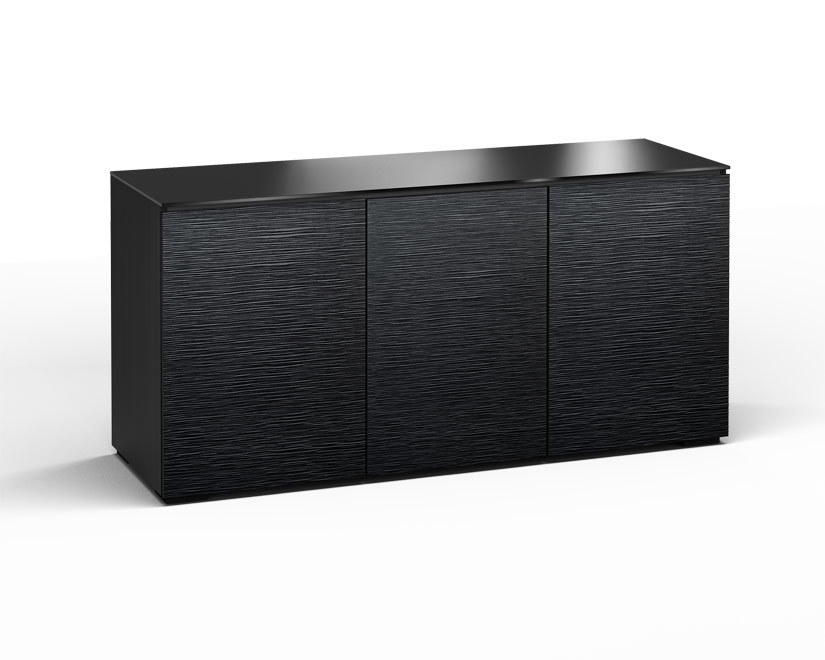 Lightly textured, black oak doors with black, tempered glass top and black oak finished side panels