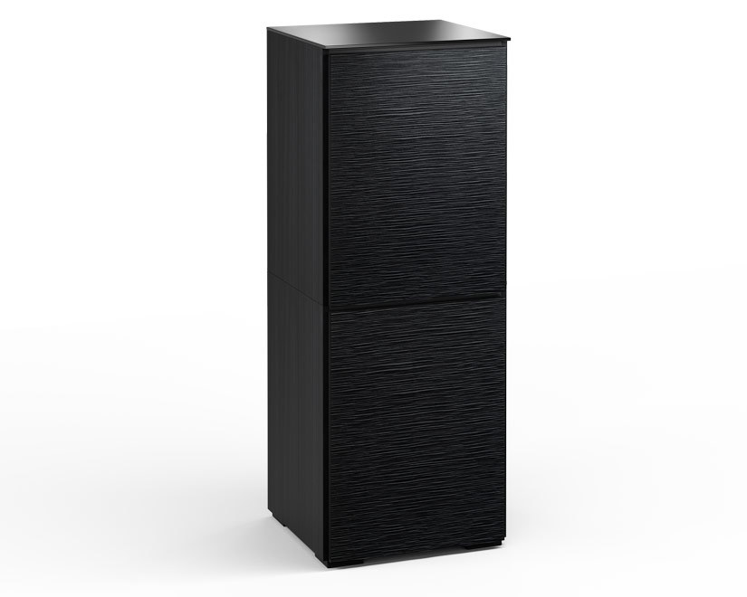 Lightly textured, black oak doors with black, tempered glass top and black oak finished side panels