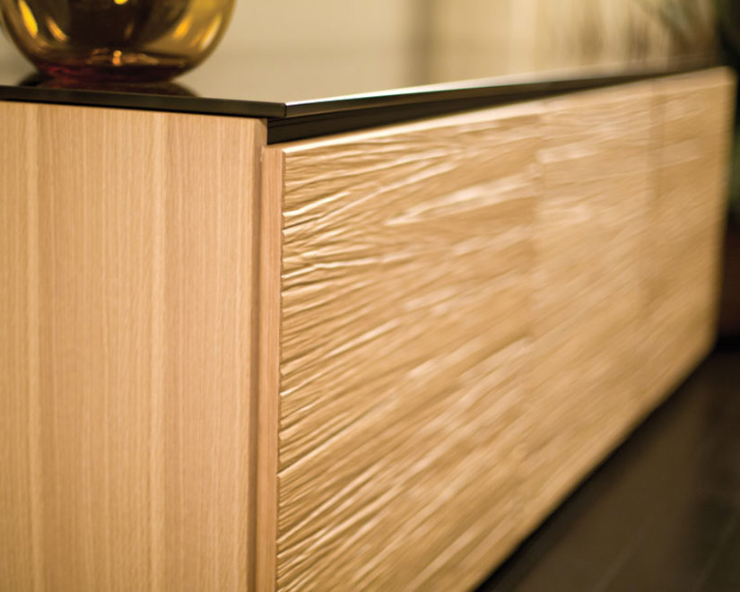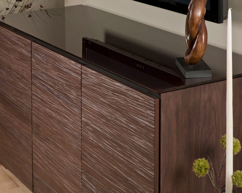 Deep textured, medium walnut or natural oak doors with tempered glass top and matching smooth side panels