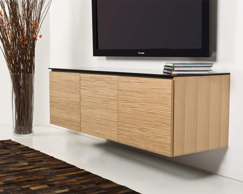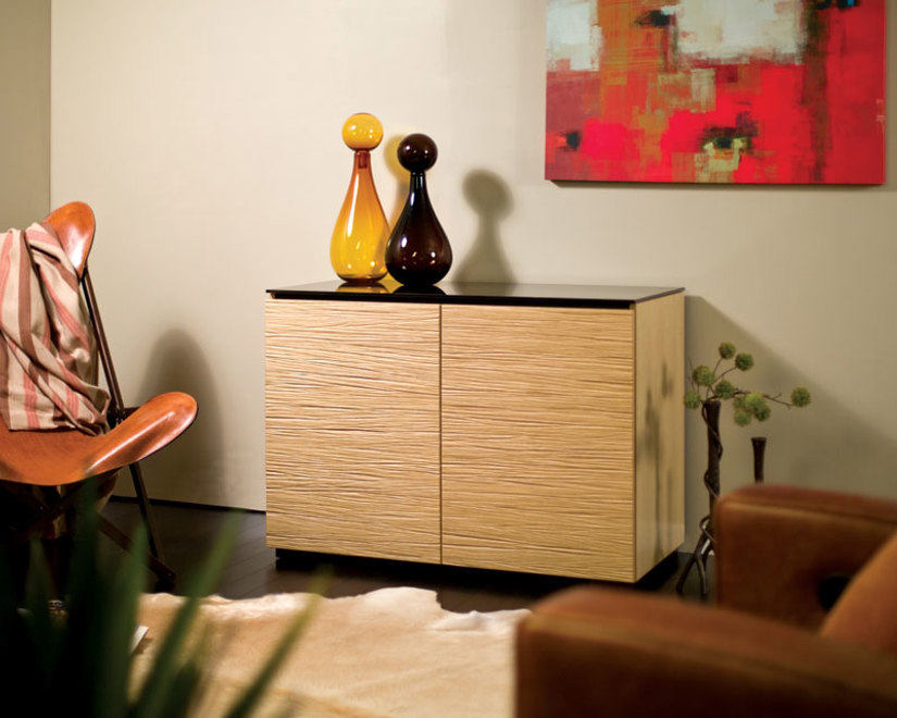 • Cabinet's center segment features an opening with a removable grille designed to hide a speaker