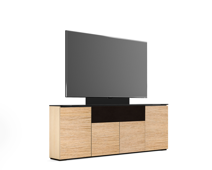 Deep textured, natural oak doors with solid surface black top and matching smooth side panels