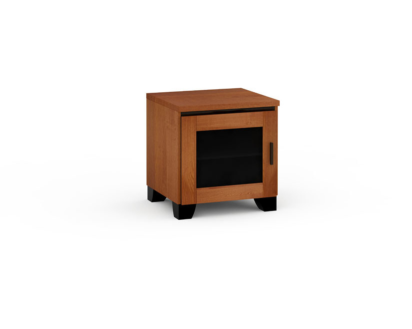 American cherry finish, wood framed smoked glass door with black aluminum pull