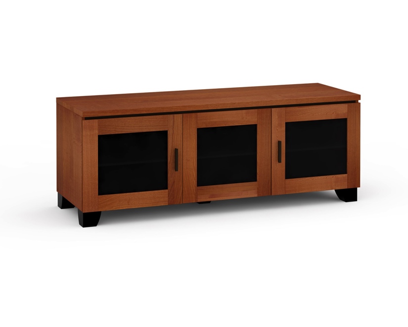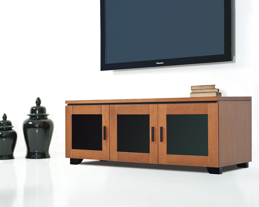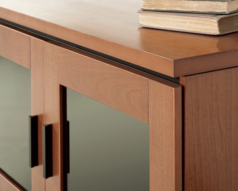 Its essence is casual comfort made unique by wide framed wood doors with smoked glass inserts. The thick wood cross section of its top give this cabinet a dramatic look.