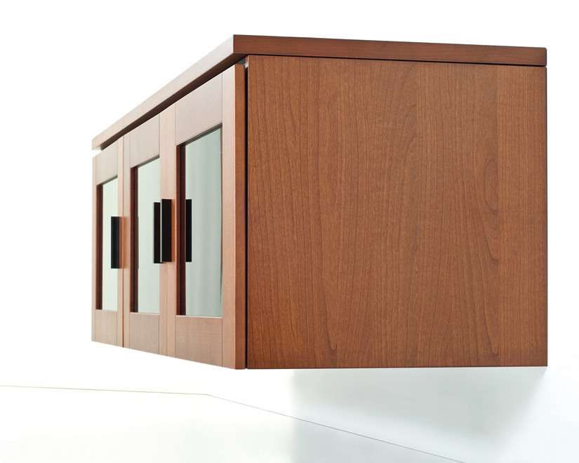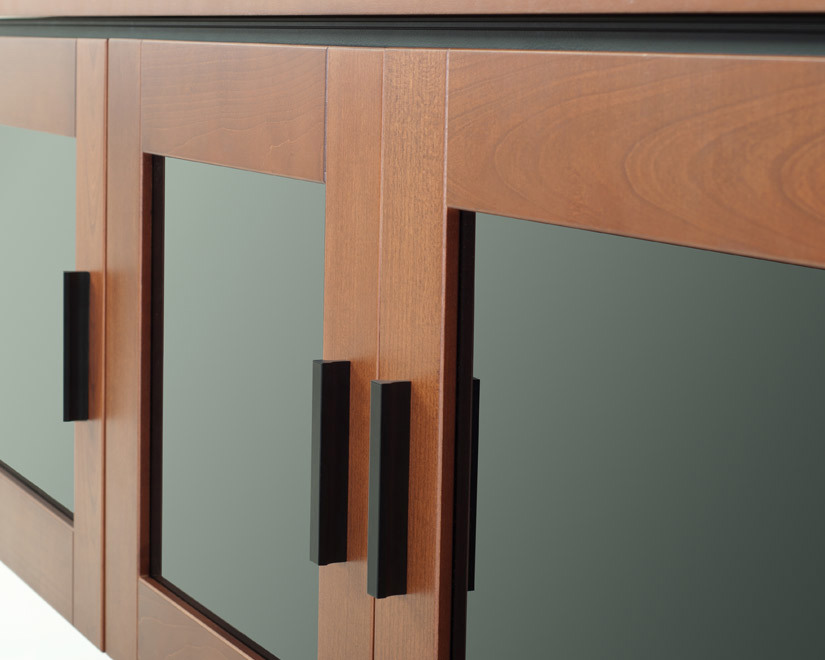 American cherry finish, wood framed smoked glass door with black aluminum pull