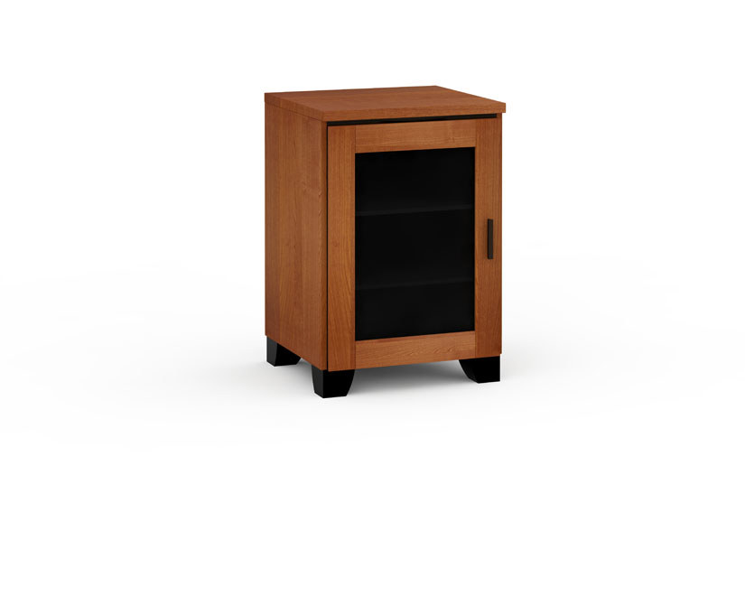 American cherry finish, wood framed smoked glass door with black aluminum pull