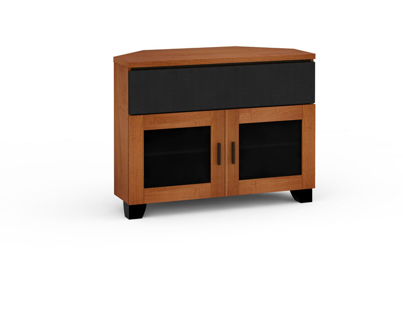 American cherry finish, wood framed smoked glass door with black aluminum pull
