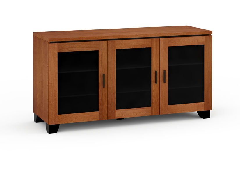 Its essence is casual comfort made unique by wide framed wood doors with smoked glass inserts. The thick wood cross section of its top give this cabinet a dramatic look.