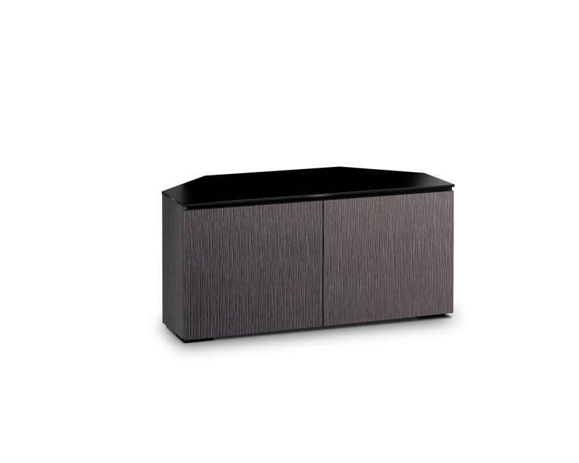 Lightly textured, alpi gray oak doors with black, tempered glass top and black oak finished end panels