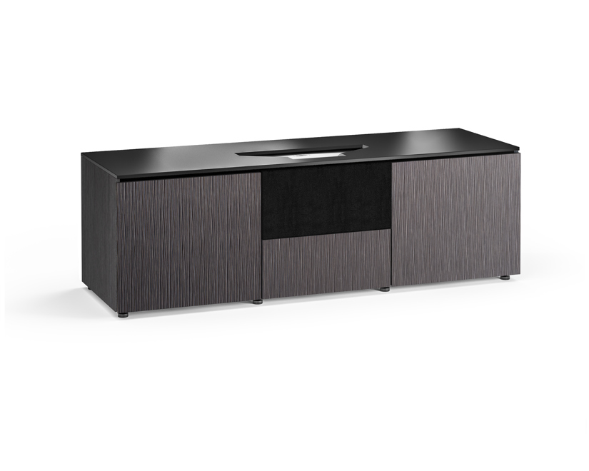 Lightly textured, alpi gray oak doors with black, tempered glass top and black oak finished end panels