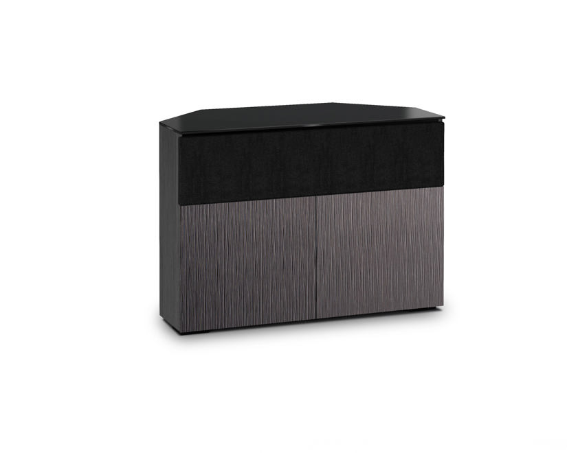 Lightly textured, alpi gray oak doors with black, tempered glass top and black oak finished end panels