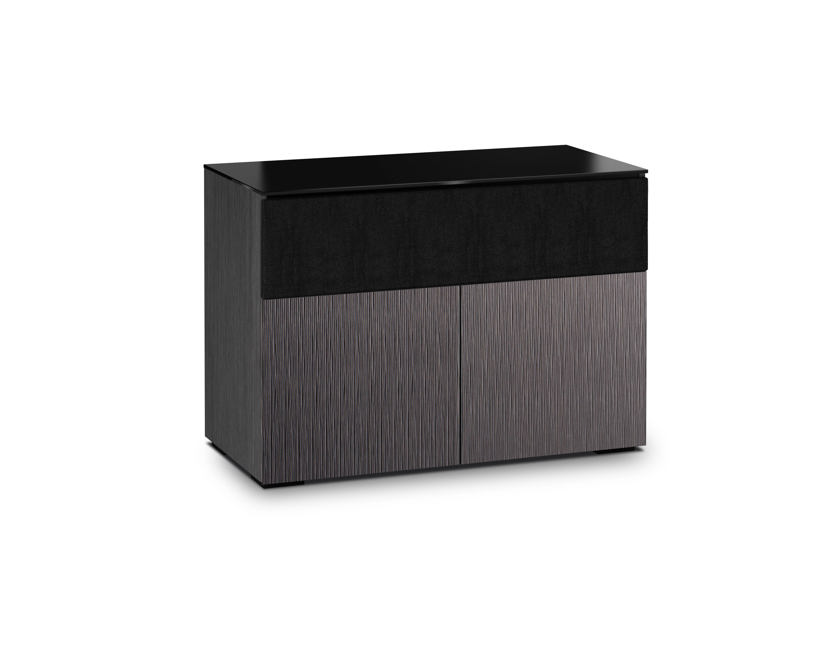 The light look and feel of tall grasses is finely set in a vertical textured pattern. Alpi gray oak with black glass top and black feet work in unison, creating the cabinet's hi-tech facade.
