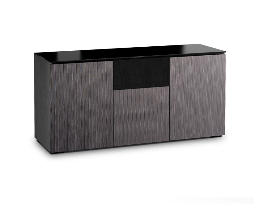 The light look and feel of tall grasses is finely set in a vertical textured pattern. Alpi gray oak with black glass top and black feet work in unison, creating the cabinet's hi-tech facade.