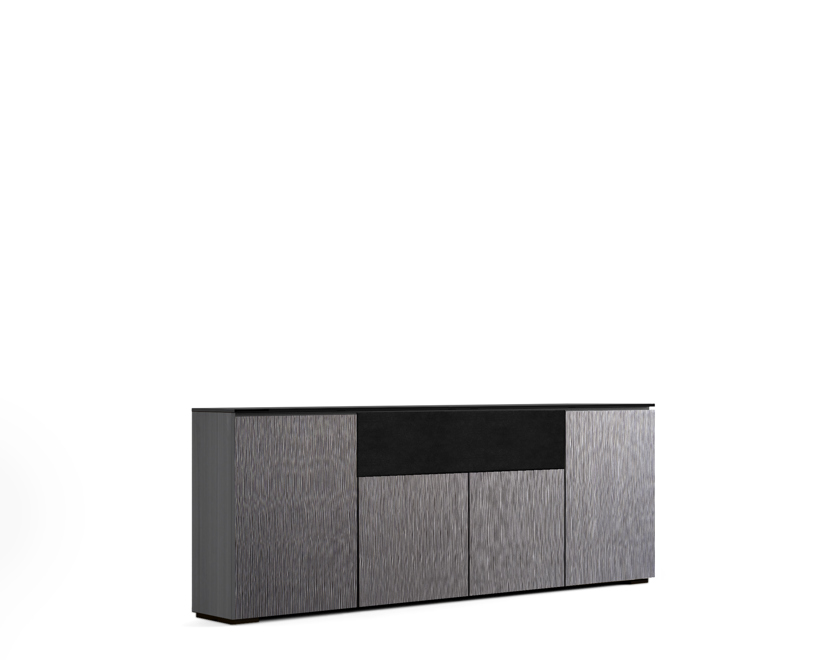 The light look and feel of tall grasses is finely set in a vertical textured pattern. Alpi gray oak with solid surface black top and black feet work in unison, creating the cabinet’s hi-tech facade.