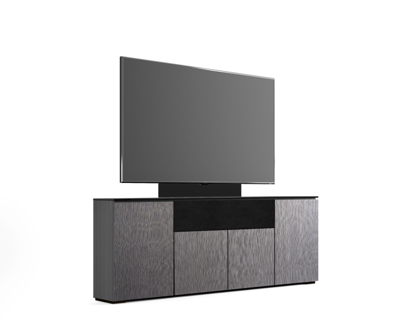 The light look and feel of tall grasses is finely set in a vertical textured pattern. Alpi gray oak with solid surface black top and black feet work in unison, creating the cabinet’s hi-tech facade.