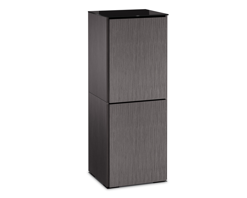 The light look and feel of tall grasses is finely set in a vertical textured pattern. Alpi gray oak with black glass top and black feet work in unison, creating the cabinet's hi-tech facade.