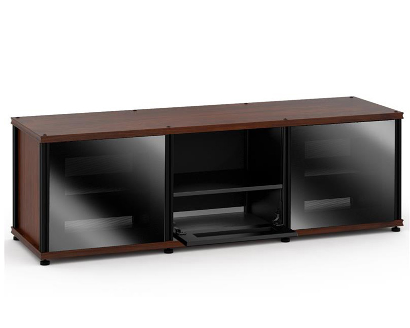 Cabinet tops and bases come in a fresh, textured Black Oak, a modern light American Cherry and classic Dark Walnut. Side panels are available in matching hardwood, black or perforated steel, or with a stunning suede-like fabric covering. while doors can be wood or black glass. Some models feature drop-down doors interior access.