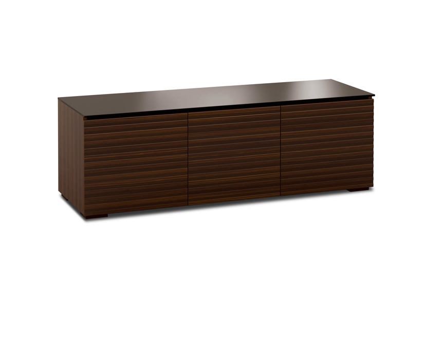 This sleek, streamlined design features a horizontal pattern on opium brown wood with a black glass top and wood block feet.