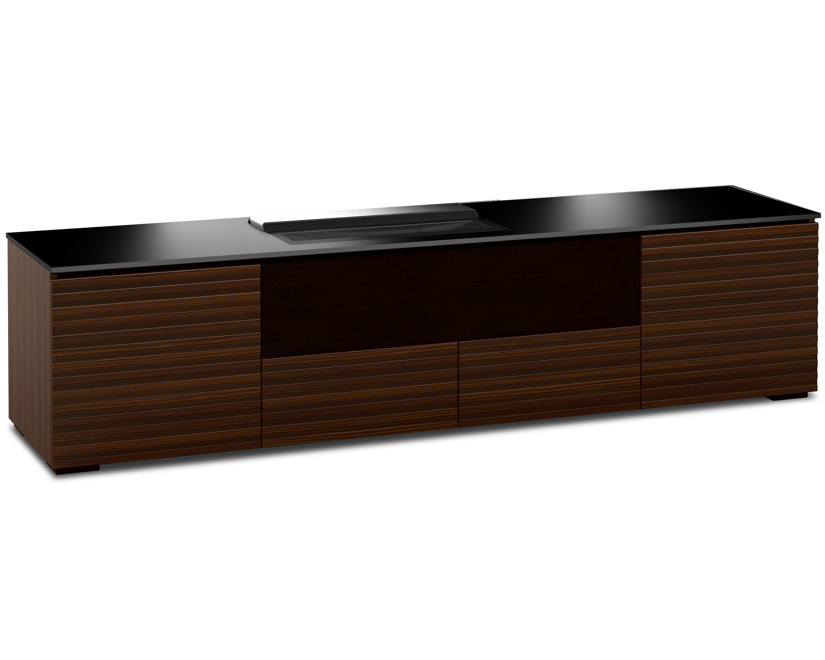 The sleek, streamlined design features a horizontal pattern on opium brown wood with a black glass or solid surface top and wood block feet.