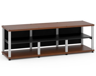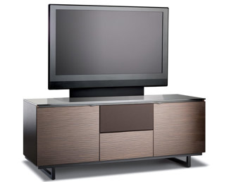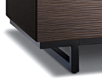 This sleek, streamlined design features a horizontal pattern on opium brown wood with a black glass top and wood block feet.