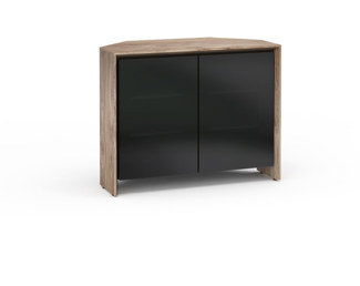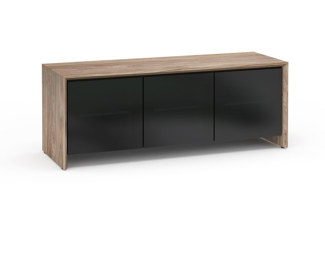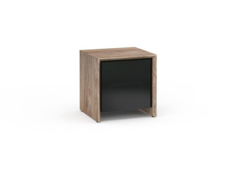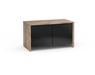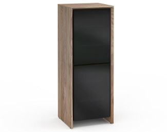 Clean, cutting-edge design with beveled edges and precision miter joints is highlighted by a natural walnut finish, and by aluminum framed, and smoked glass doors.