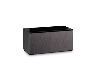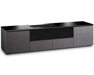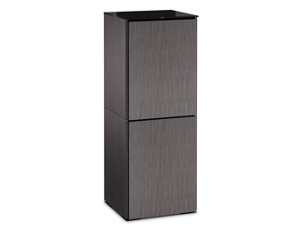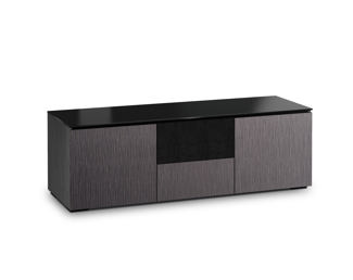 Lightly textured, alpi gray oak doors with black, tempered glass top and black oak finished end panels