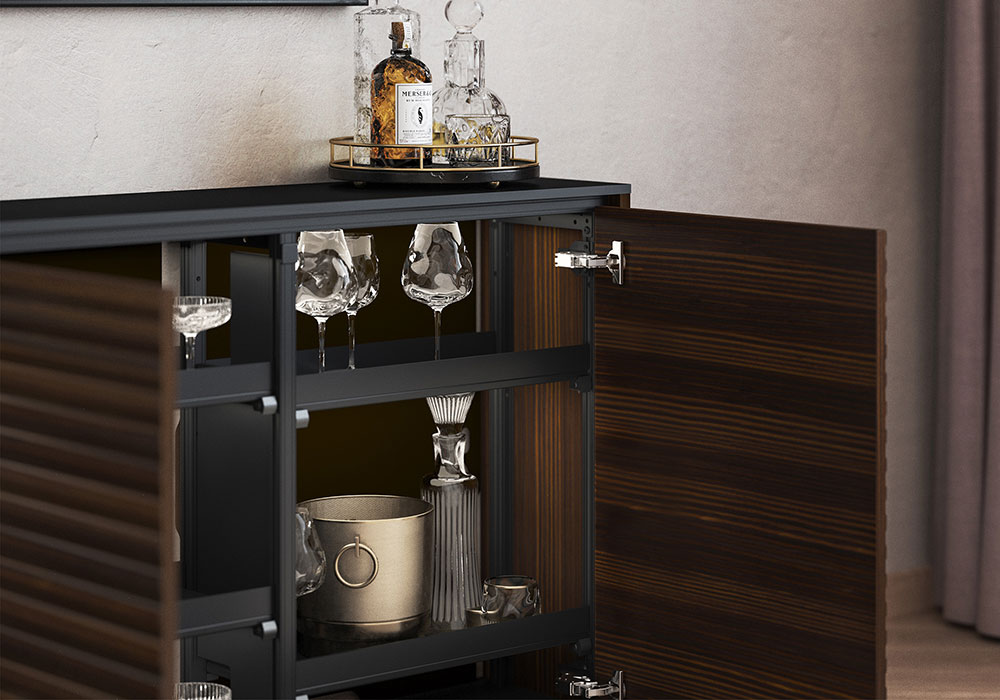 Upgrade your bar with a sleek, decor-friendly cabinet featuring personalized shelves and storage for every need.