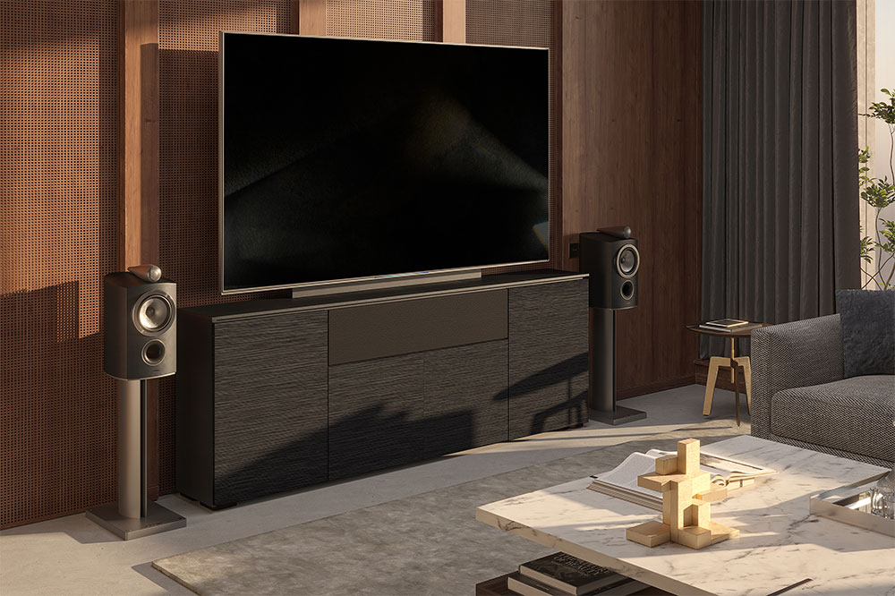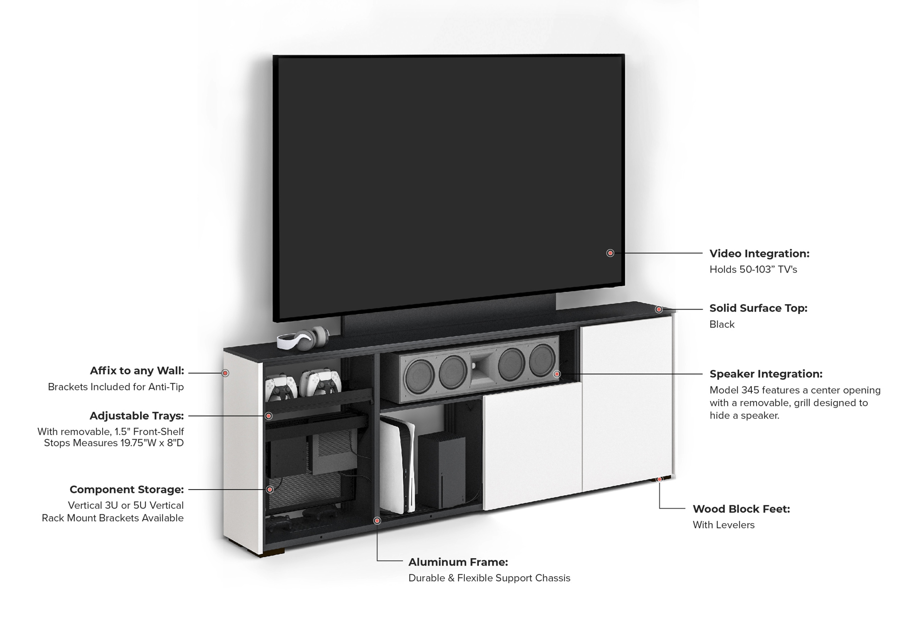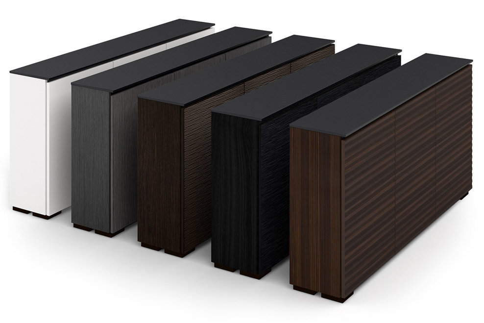 This piece can be easily configured to suit your entertainment electronics and vision while making the most of your room. Despite being only 12-inches deep, the Ultra-Low-Profile Cabinet can fully accommodate screens from 55 inches up to 100-inch displays plus all essential A/V technology and cables – without taking up space. This elegant piece not only supports full media systems and compact spaces – it defines them.