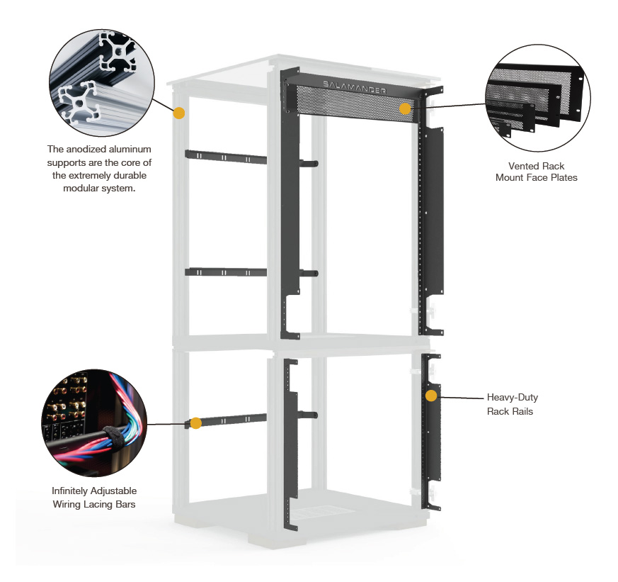 A fully modular pro audio system that takes customization to a whole new level. A virtually limitless number of configurations and an extensive range of accessories allow you to create highly personalized Pro Audio racks and cabinets with premium components that will deliver exceptional reliability and durability. Mounts are compatible with industry standard, EIA 19” components.