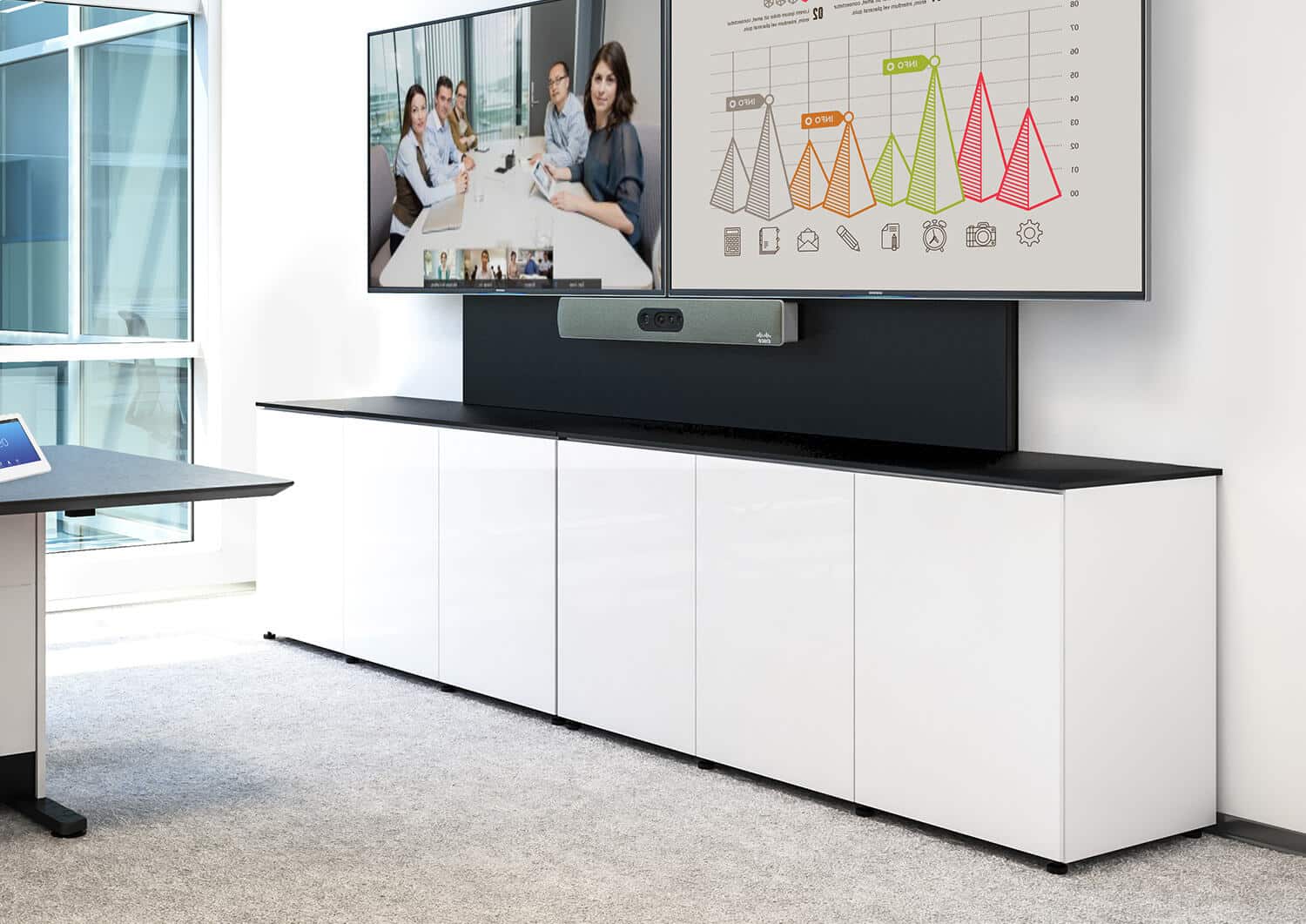 Design and deploy cabinet systems quickly that handle displays of all sizes without wall reinforcement or construction. Salamander Cabinets optimize all the electronics, including single to multiple displays, sound systems and camera positioning for turnkey collaboration and conferencing.