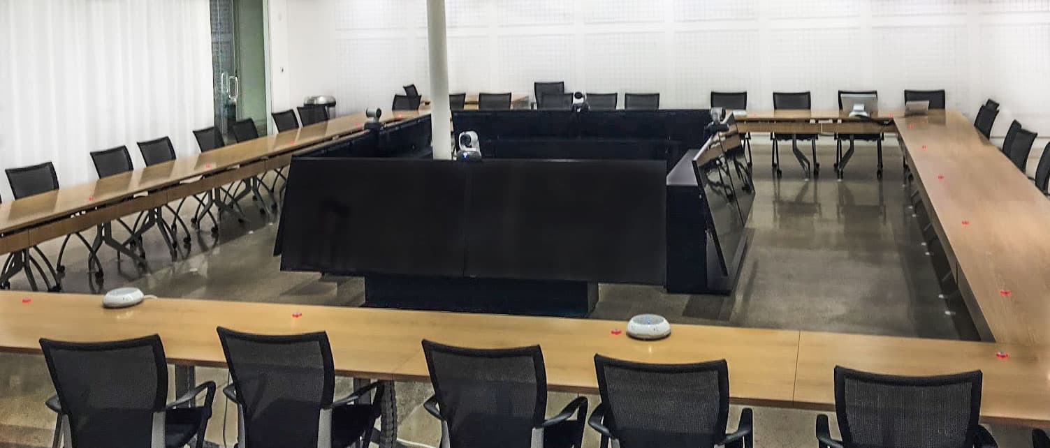 The solution includes a stylish four cabinet, custom configuration arranged at the center of the room, each cabinet supporting two monitors and a camera. They met the goal of assuring that all participants, regardless of their height or position in the room, could see the displays comfortably and easily. Salamander started by studying the employee work habits, so no adjustment to monitor locations or angles would be necessary to allow every room occupant to participate.