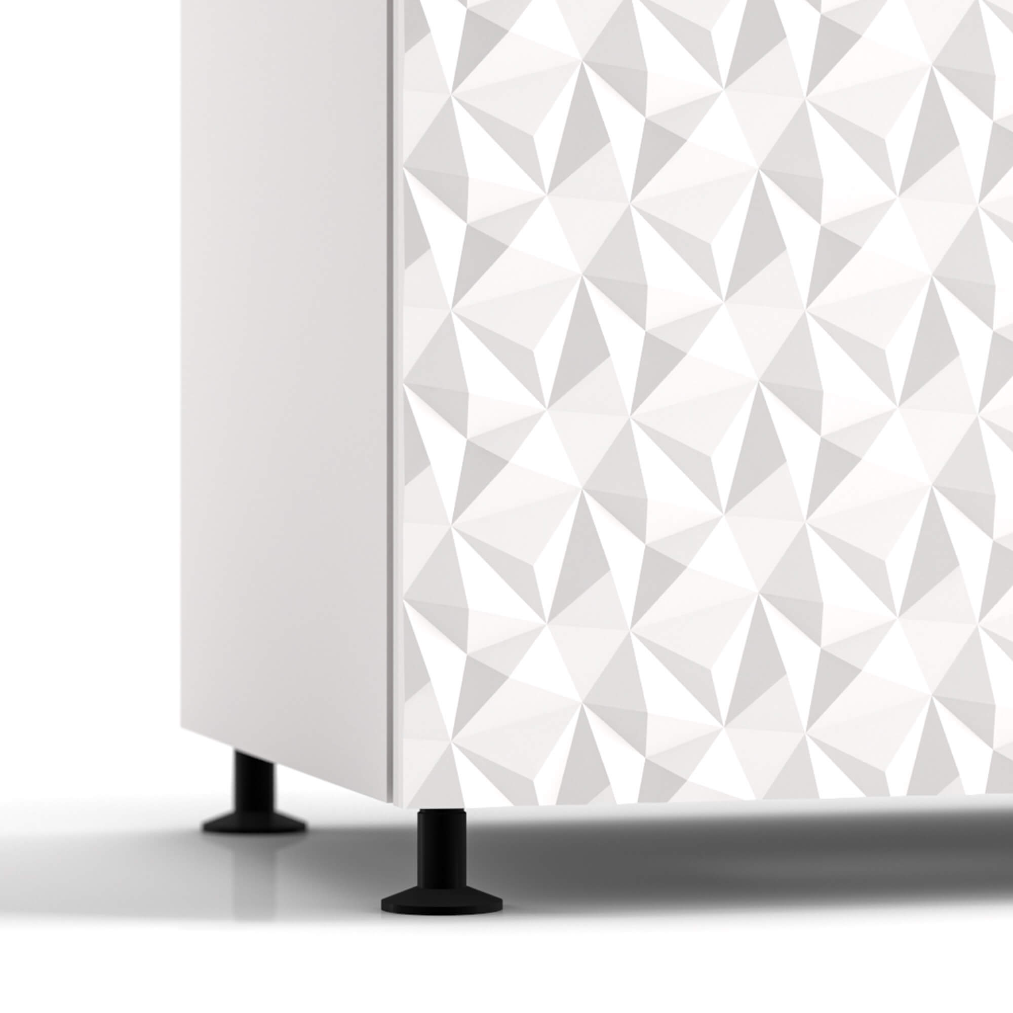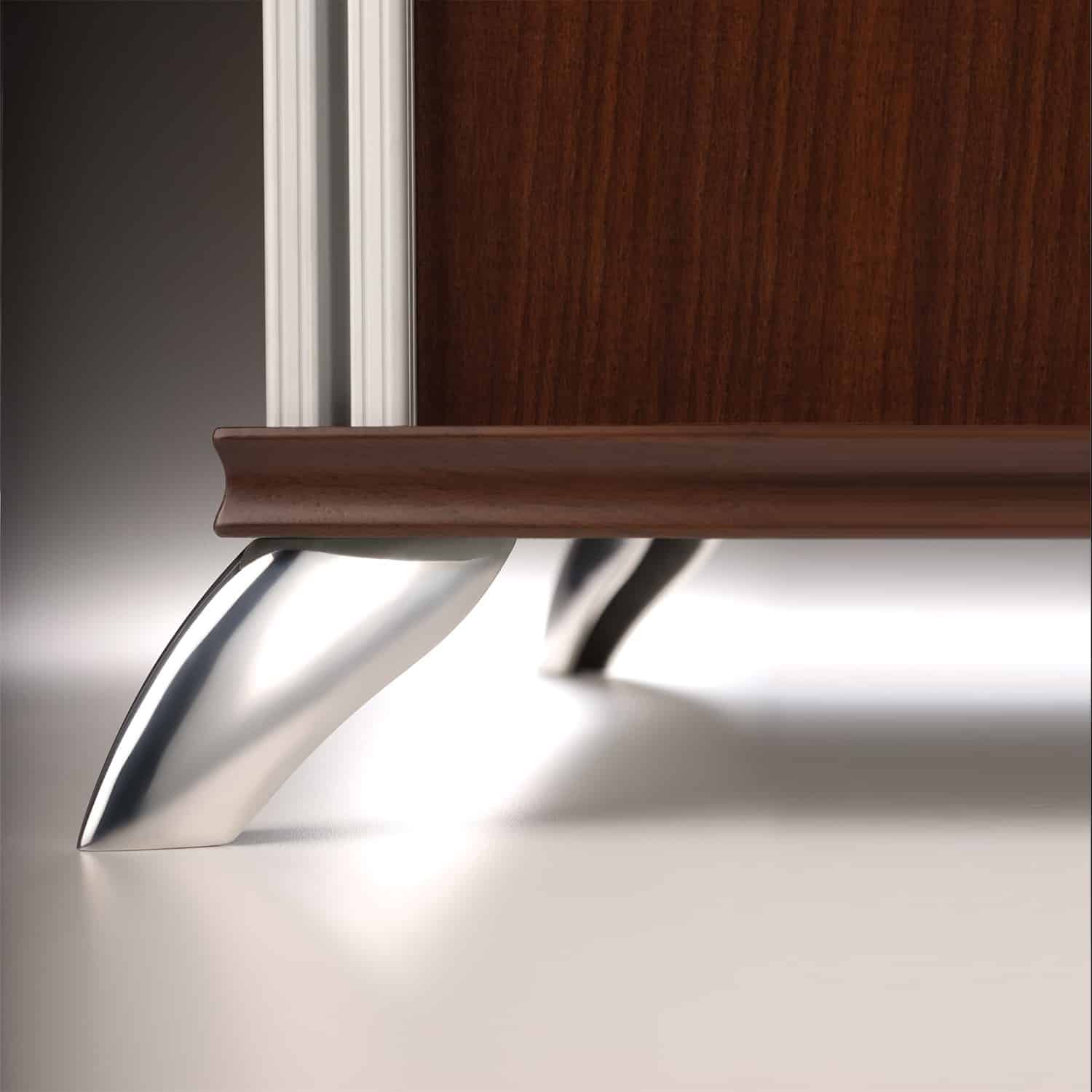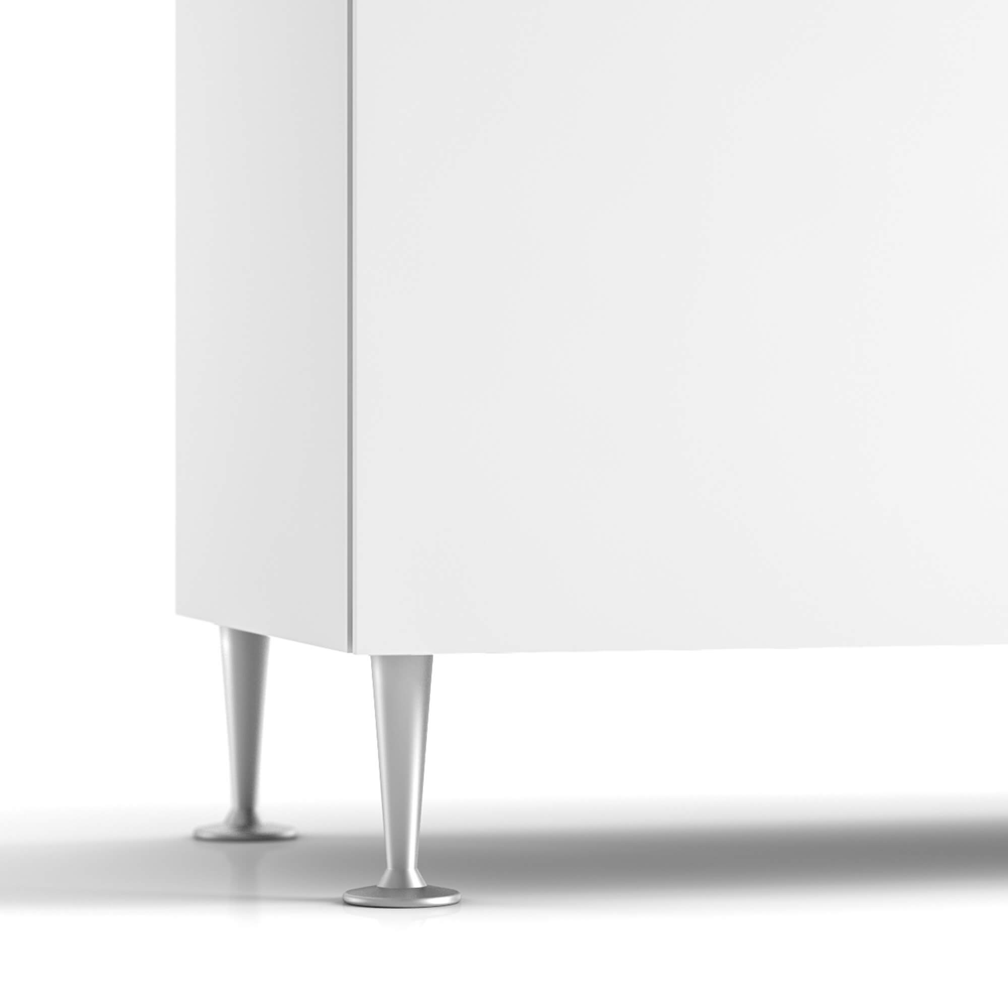 - Des niveleurs réglables dissimulés intégrés à chaque pied vous permettent de mettre le meuble parfaitement à niveau sur des surfaces inégales sans quincaillerie apparente.