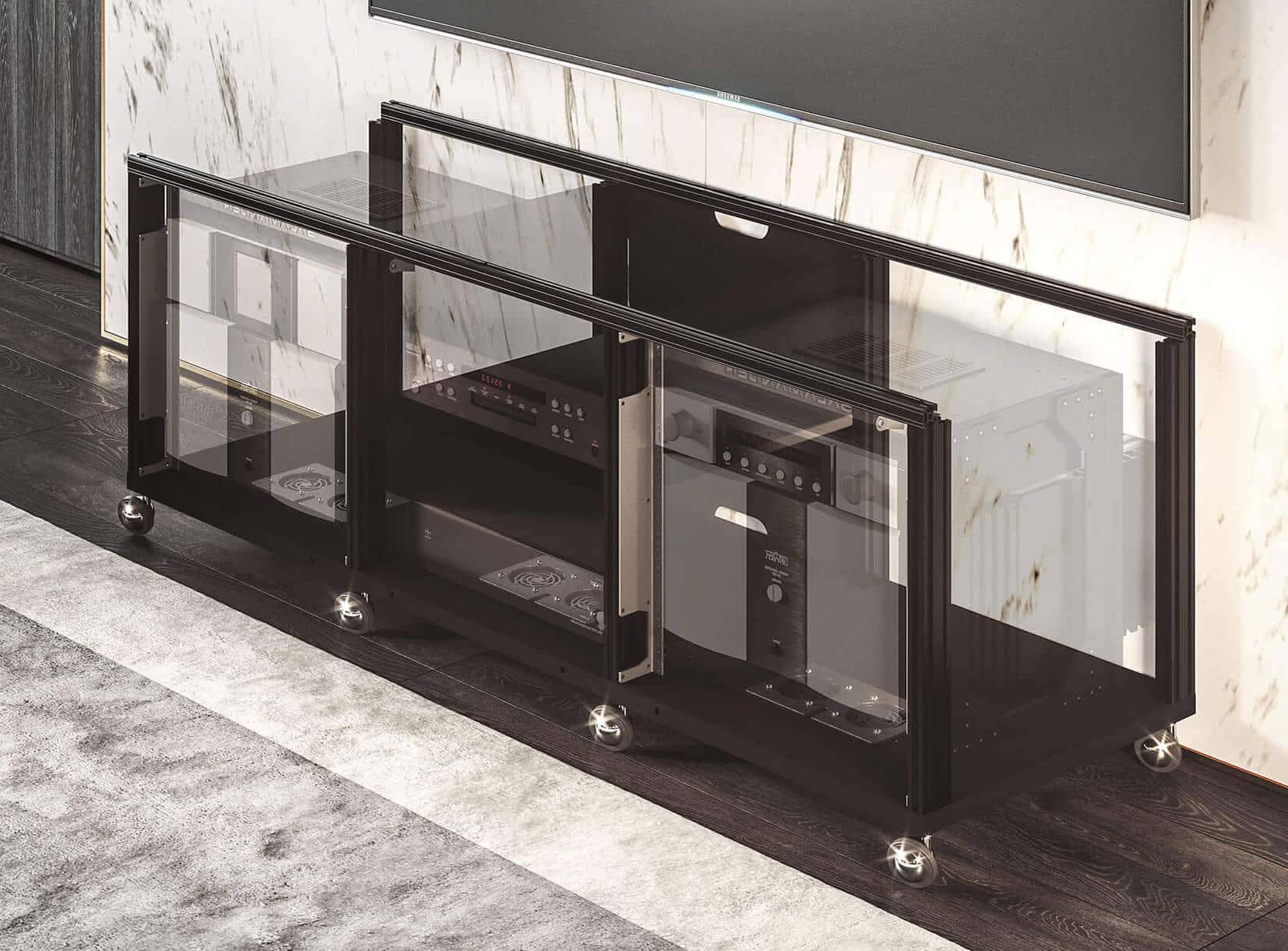 - Les rails de guidage du meuble et la base à roulettes alignées facilitent l'utilisation et le transport.