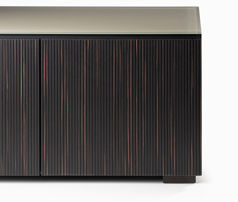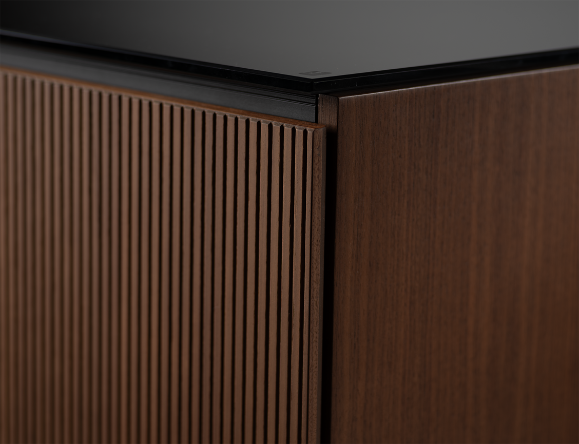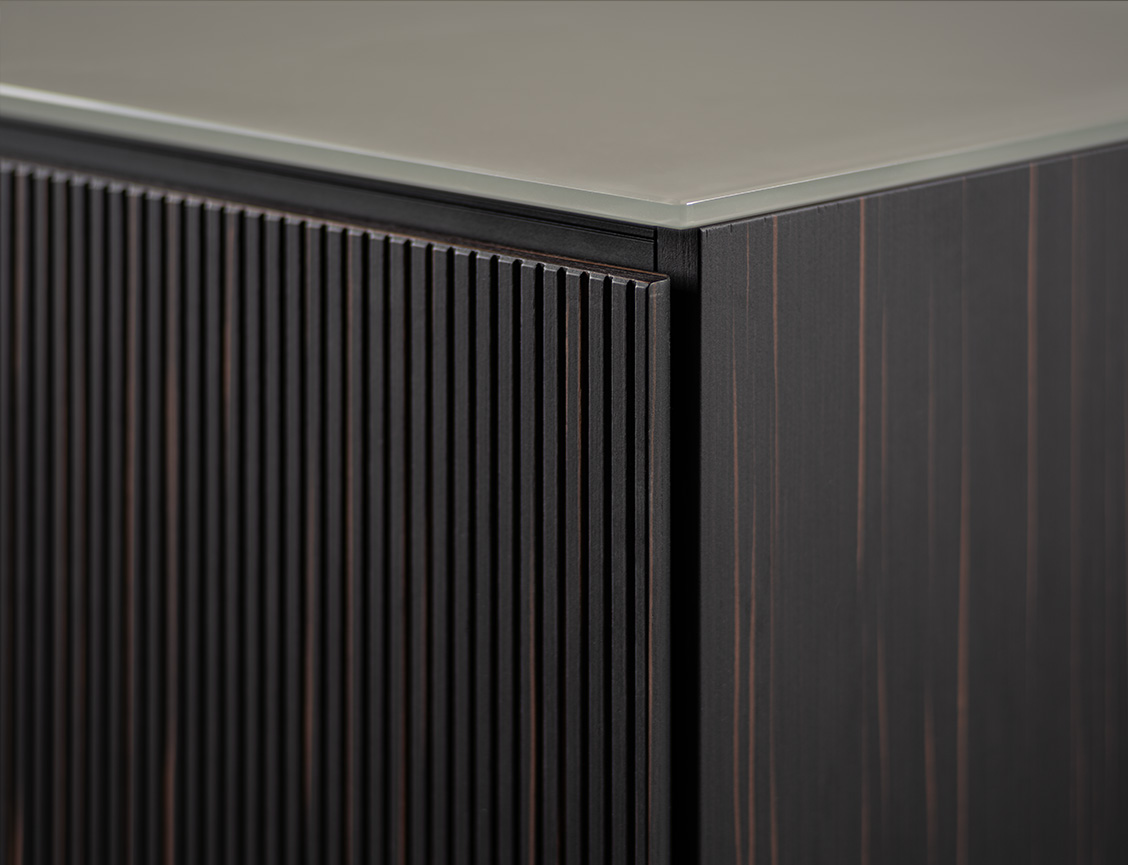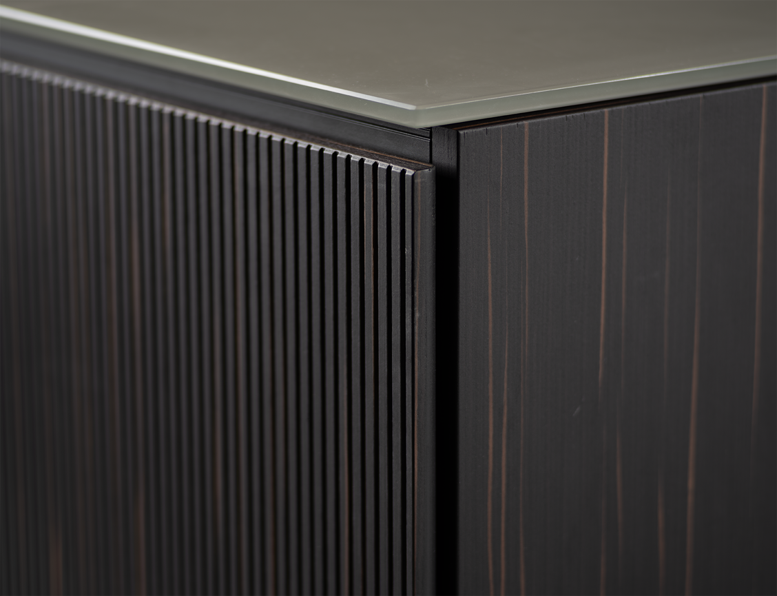 Complementing the fine finishes are two distinctive top options. The Black Glass Top provides a sleek, reflective surface that delivers a clean, modern aesthetic. The Taupe Etched Glass Top brings a soft, matte finish that offers a warm, non-reflective surface—simple yet rich in tone and sophistication.