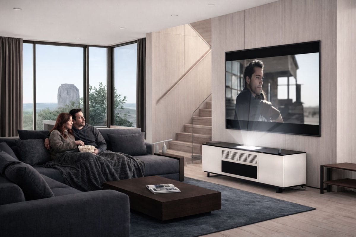 A simple installation with no need to open the wall or ceiling to run cables. All supporting components including a speaker system that can be enclosed in the cabinet to provide a beautiful and simple solution.