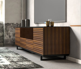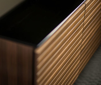 This opium brown finish on Larch veneer reflects authentic grain complemented by black glass top and sides. The textured horizontal pattern lends itself to railroad track nostalgia once and still an integral connection for all European travel. The durable chassis and adaptable bays provide a “solutions” approach for all your current and emerging AV storage needs.