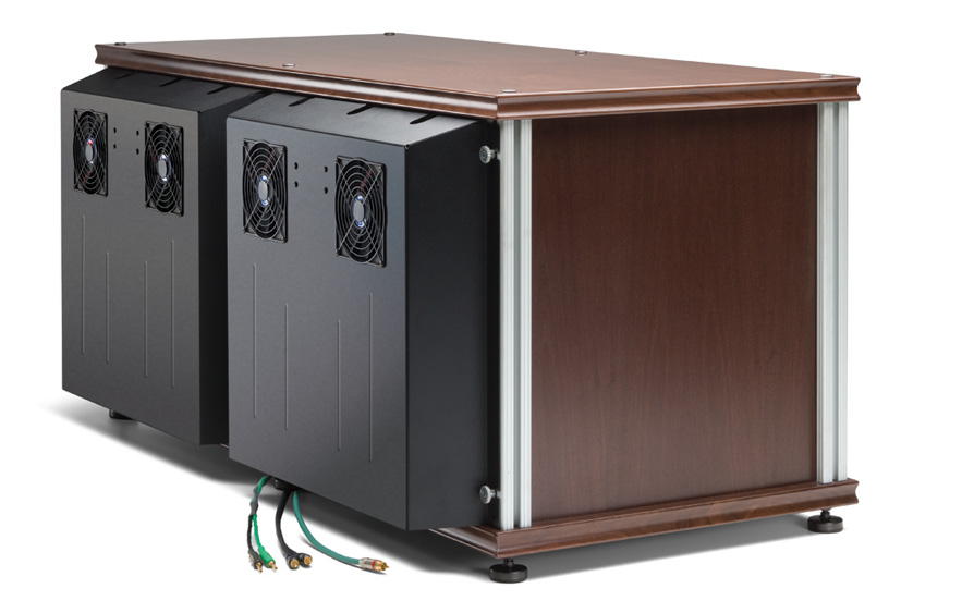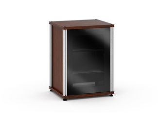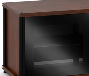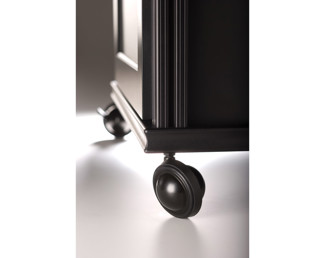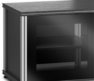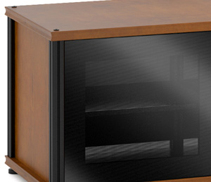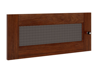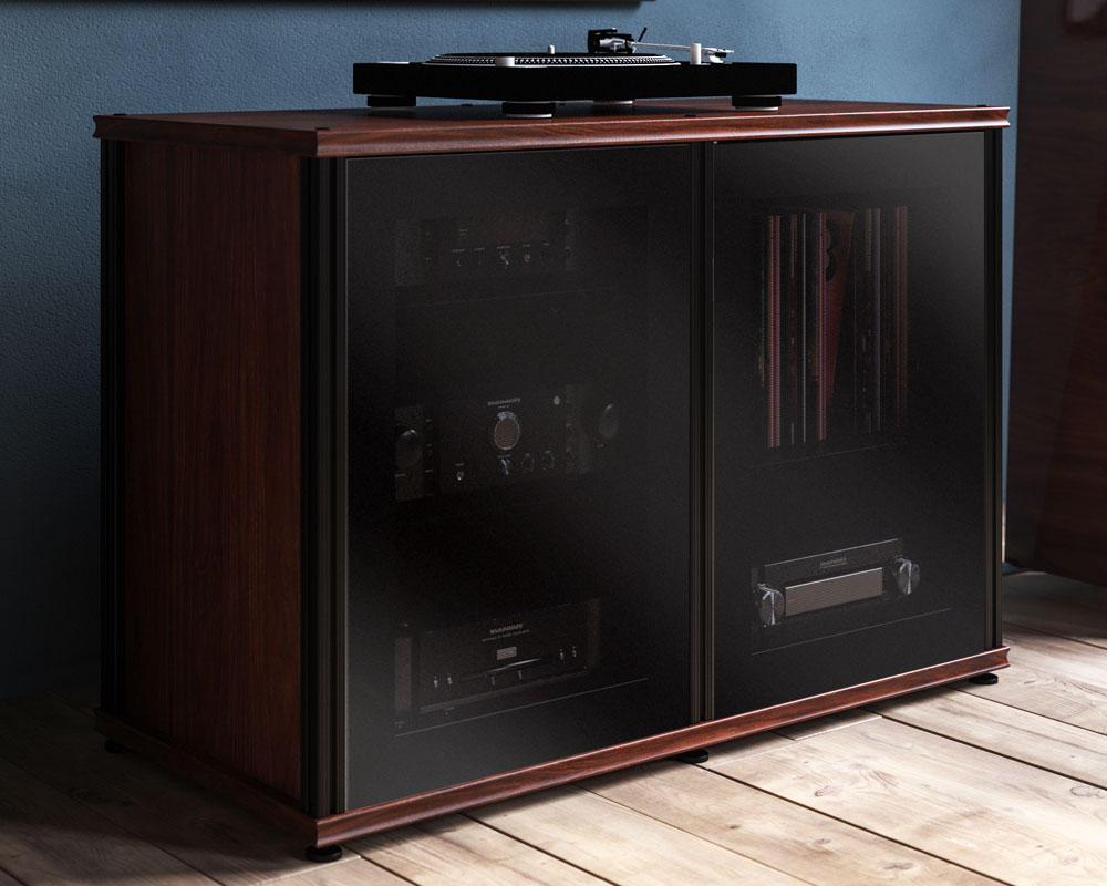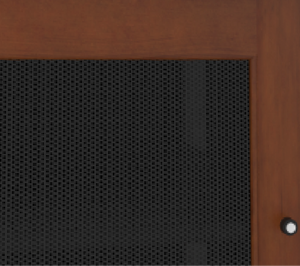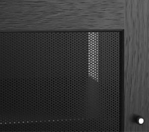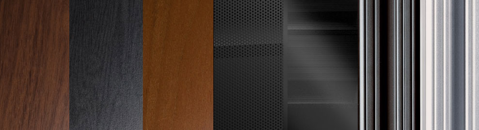 Cabinet tops and bases come in a fresh, textured Black Oak, a modern light American Cherry and classic Dark Walnut. Side panels are available in matching hardwood, black or perforated steel, or with a stunning suede-like fabric covering. while doors can be wood or black glass. Some models feature drop-down doors interior access.