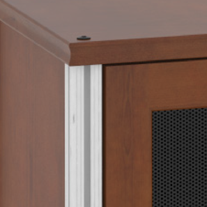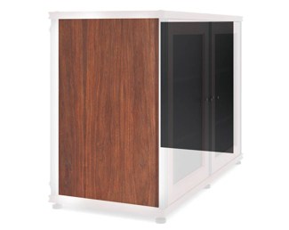 From beautiful, solid aluminum posts in matte black or silver to a variety of real hardwoods, glass and more, Synergy offers options to create your own design. Cabinet tops and bases come in a fresh, textured Black Oak, a modern light American Cherry and classic Dark Walnut. Side panels are available in matching hardwood, black or perforated steel, while doors can be wood or black glass. Some models feature drop-down door interior access. It’s your choice!
